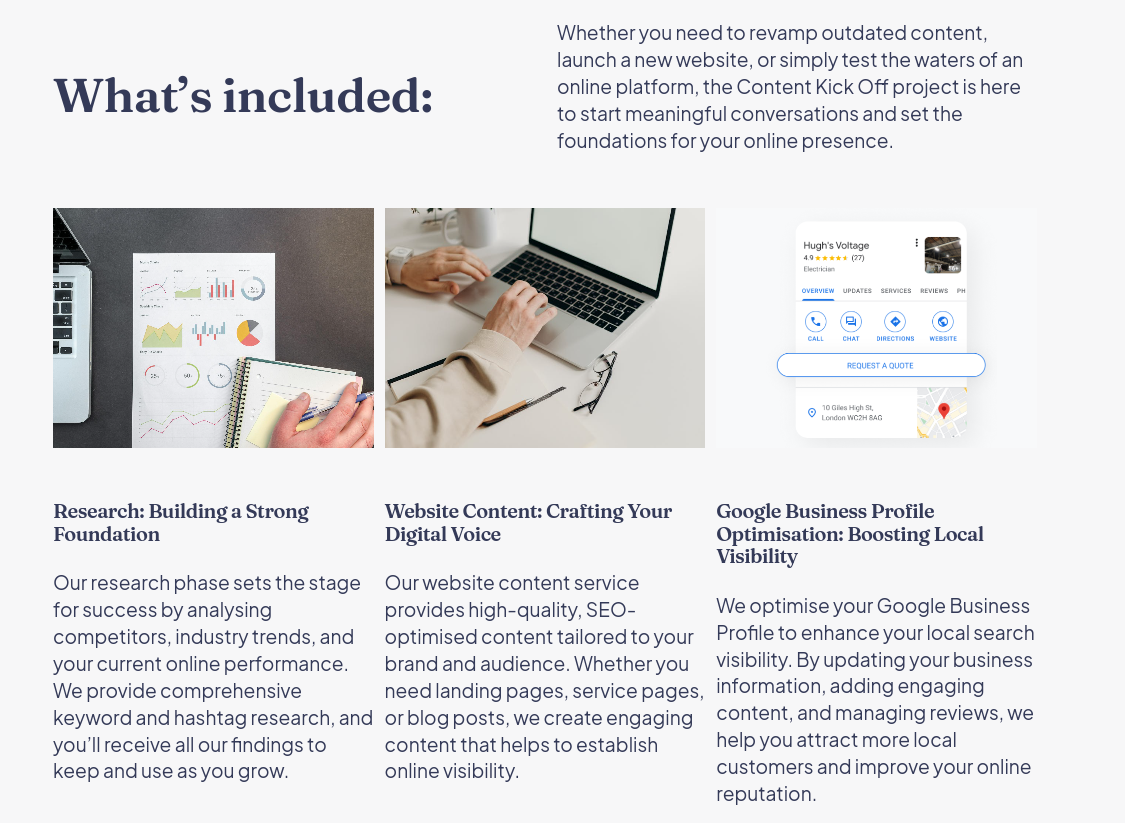 We start by getting to know your brand through a detailed questionnaire and initial consultation. We also review any existing materials to ensure the new copy is consistent with your established tone and style. If you’re not entirely sure on your tone of voice, we can work on one together!